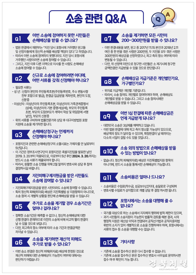 이에 포항시는 구비서류 발급 등 시민들의 불편 해소를 위한 안내센터 운영을 준비하는 한편 시민들의 궁금증을 해소하고 기본적인 정보를 알려주기 위해 ‘포항촉발 지진 소송 관련 질의·응답집’을 긴급 배부했다.