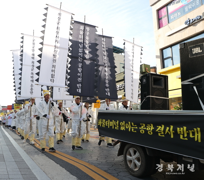 의성군 이장연합회를 비롯한 통합신공항 이전지원위원회·의성청년회의소·서의성청년회의소·의성소문회·자율방범대·의성4-H엽합회 등 회원 500여명은 상복을 입고 ‘빈껍데기 신공항 억울해서 눈 못감겠다’현수막을 선두로, 의성군청 앞마당에서 의성종합운동장까지 상여를 메고 ‘신공항 장례식’을 연출하는 가두행진을 벌였다.