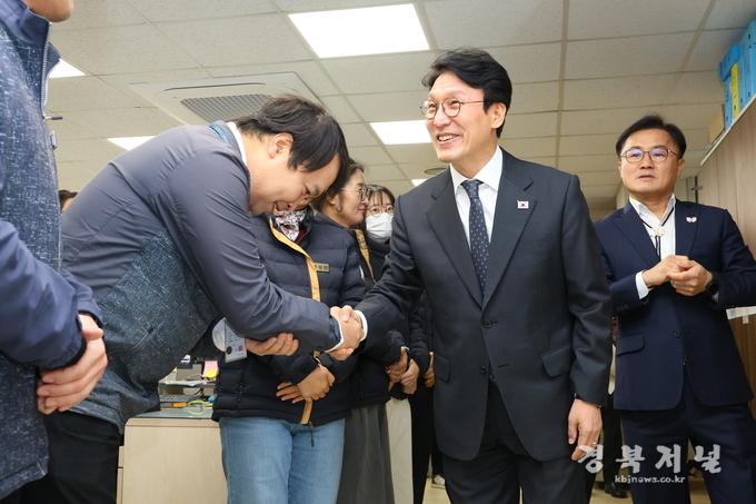 김민석 국무총리가 20일 오전 경주시청을 찾아 2025 APEC 정상회의 준비·운영에 참여한 시청 직원들을 격려하고 주요 부서를 둘러봤다.