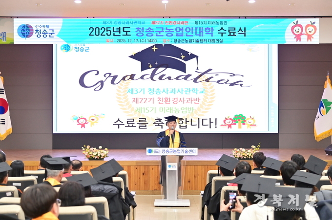 청송군(군수 윤경희)은 지난 17일 청송군농업기술센터 대회의실에서 수료생과 관계자 등 100여 명이 참석한 가운데 ‘2025년도 청송군농업인대학 수료식’을 개최하고, 지역 농업의 미래를 이끌 정예 농업인 99명을 배출했다.