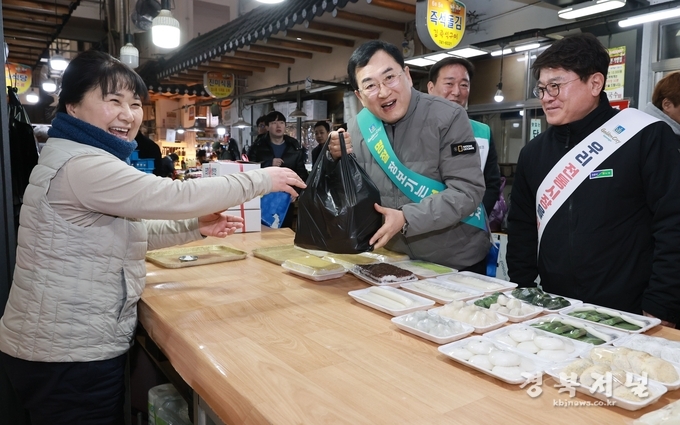 주 시장은 중앙시장 북편 상설무대 앞에서 인사말과 기념촬영을 한 뒤 시장 곳곳을 돌며 식료품점과 청과상, 건어물점, 잡화점 등에서 설 성수품을 직접 구매했다.