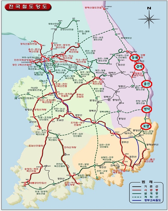 현재 시공 중 인 포항~삼척 간 철도 건설 사업은 단선 비전철화로 2002년부터 계획하여 1단계 사업인 포항~영덕구간은 공정률 95%로 2017년 상반기 개통 예정이며, 2단계 사업구간인 영덕~삼척은 2020년 개통을 목표로 박차를 가하고 있으나, 설계속도가 150~200㎞/h로 정부의 고속화 철도(250㎞/h)의 역점추진에 미치지 못하고 있다. 비 전철화시 포항~삼척 간 운행시간이 1시간 17분정도 소요되나 전철화가 되면 50분 이내로 크게 단축될 것으로 예상된다.