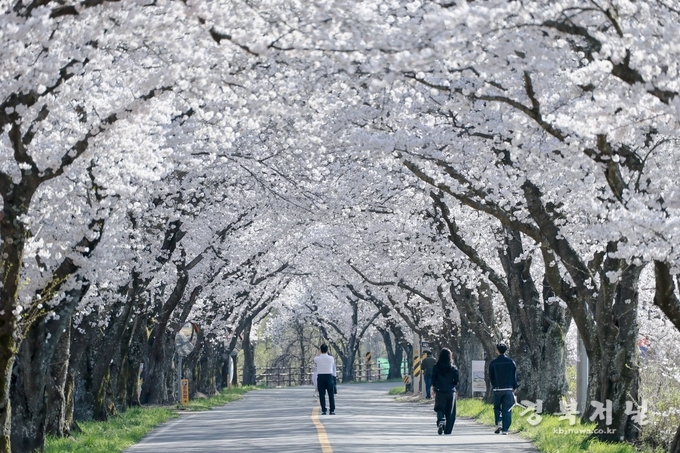 경주시는 암곡동 일원 도로 구간이 이른바 ‘암곡 벚꽃 터널’로 불리며 도심보다 늦게 꽃이 피어 상춘객들의 발길을 끌고 있다고 9일 밝혔다.