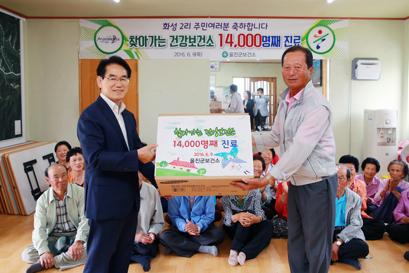 [울진]울진군(군수 임광원)은 6월 9일 죽변면 화성2리 마을회관에서 군민과 함께하는 찾아가는 건강보건소 1만4,000명째 진료 기념행사를 가졌다.