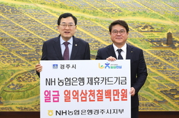 경주시는 25일 시청 대외협력실에서 NH농협은행 경주시지부(지부장 황대화)로부터 지난해 제휴카드 사용에 따른 적립기금 1억 3,715만 5,240원을 전달받았다. 이번 적립기금은 경주시와 NH농협은행 간 제휴카드 약정에 따라 조성된 것으로, 2025년 한 해 동안 시가 사용한 법인카드, 보조금카드, 공무원복지카드 이용금액의 0.3~1.0%가 포인트로 적립돼 마련됐다. 시는 예산 집행의 투명성과 재정 운영의 효율성을 높이기 위해 전 부서를 대상으로 카드 사용을 적극 권장해 왔으며, 이에 따라 매년 안정적인 규모의 적립기금을 확보하고 있다. 이날 전달받은 기금은 시 세입으로 처리돼 시민 복지 증진과 지역사회 발전을 위한 각종 시책사업 재원으로 활용될 예정이다. 주낙영 경주시장은 “제휴카드 적립기금은 예산 집행의 투명성을 높이는 동시에 시민을 위한 소중한 재원을 마련했다는 점에서 의미가 크다”라며, “앞으로도 농협은행 경주시지부와의 협력을 더욱 강화해 시민 편익 증진과 지역 상생에 더욱 힘쓰겠다”고 밝혔다. 최선학 기자 kbnews7005@hanmail.net