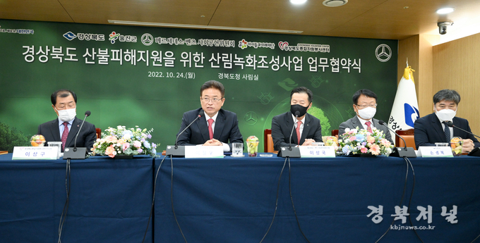 경북도는 24일 도청 사림실에서 울진군, 메르세데스-벤츠 사회공헌위원회, 아이들과 미래재단, 경북종합자원봉사센터와「경북 산불피해 지원을 위한 산림녹화조성사업 업무협약」을 체결하고 기부금 전달식을 개최했다.