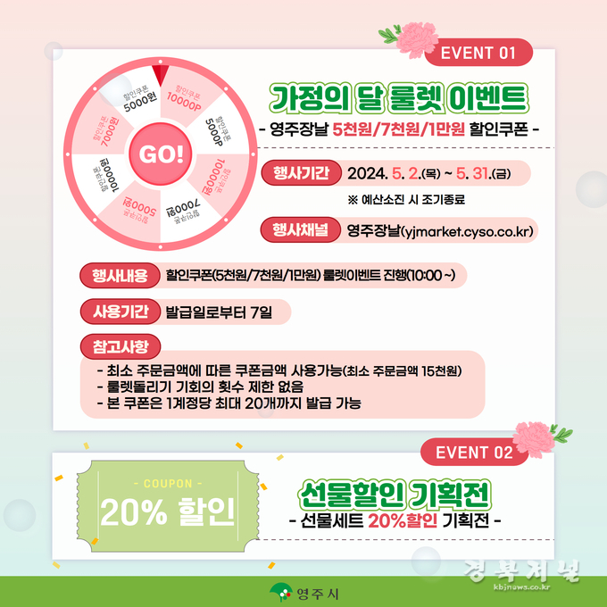 ‘영주장날 쇼핑몰’ 가정의 달 맞이 기획전 행사에서는 △가정의 달 선물세트 20% 할인행사 △매일 최대 10,000원 할인쿠폰 룰렛 이벤트 등 다양한 행사가 진행된다.
