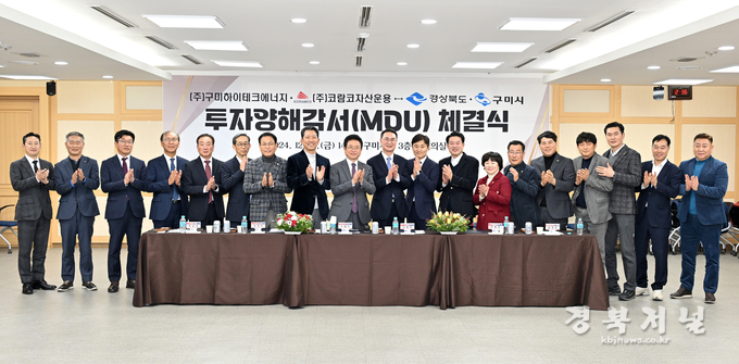 경상북도는 13일 구미시청 대회의실에서 4개 기관(경북도, 구미시, ㈜구미하이테크에너지, ㈜코람자산운용)이 AI데이터센터+수소연료전지발전소 건립을 위한 투자협약(MOU)을 체결했다.