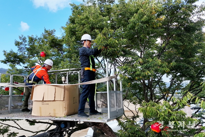 군수는 17일 축제장 중앙의 느티나무 앞에서 리프트기에 올라 사과 조형물을 직접 설치하며 축제 준비를 진두지휘했다.