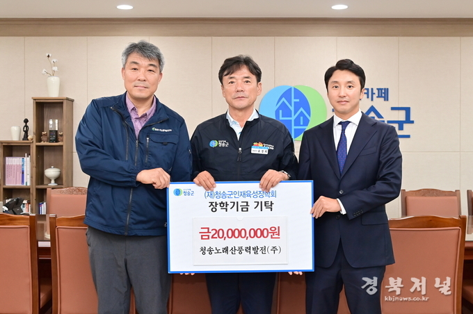 청송노래산풍력발전(주)(대표 노광철)은 지난 16일 지역사회와의 상생 및 미래 인재 육성을 위해 (재)청송군인재육성장학회에 장학금 2천만 원을 기탁했다.
