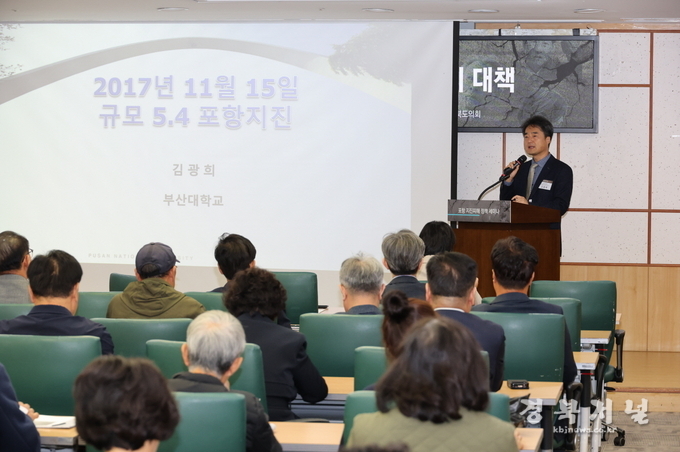 첫 번째 발표자인 김광희 부산대학교 교수는 ‘2017년 11월 15일 규모5.4 포항지진’을 주제로 포항촉발지진의 원인과 지진발생과정을 과학적으로 설명했다.