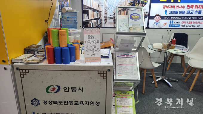 안동시 평생학습 홍보부스에서 박람회 방문객들에게 국립경국대 의과대학 유치를 위한 리플렛과 홍보물품을 배부하며, 경북 북부권의 열악한 의료현실과 경북 국립의과대학 신설 필요성을 알렸다.
