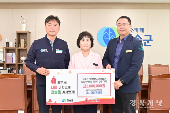 청송군(군수 윤경희)은 지난 21일 (재)한국수성사회의학연구소 이시아한방병원(원장 임차영)이 청송군을 방문해 관내 의료 취약계층을 위한 성금 200만 원을 기탁했다고 밝혔다.