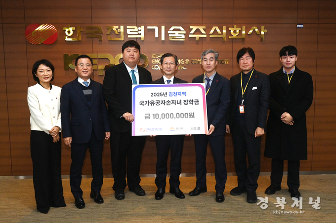 한국전력기술(사장 김태균, 이하 ‘한전기술’)은 2일 김천 본사에서 김천시, 사회적협동조합 씨드콥과 함께 김천시에 거주하는 국가유공자 손자녀에게 장학금을 전달했다.