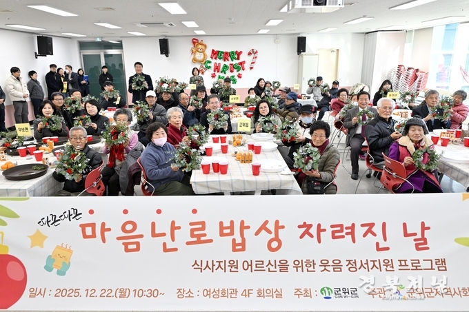 군위군지역사회보장협의체(공공위원장 김진열, 민간위원장 김미정)는 지난 22일 삼국유사교육문화회관에서 관내 저소득 독거 어르신 50명을 초청해 ‘마음난로 밥상 차려진 날’이라는 프로그램을 성황리에 개최했다.