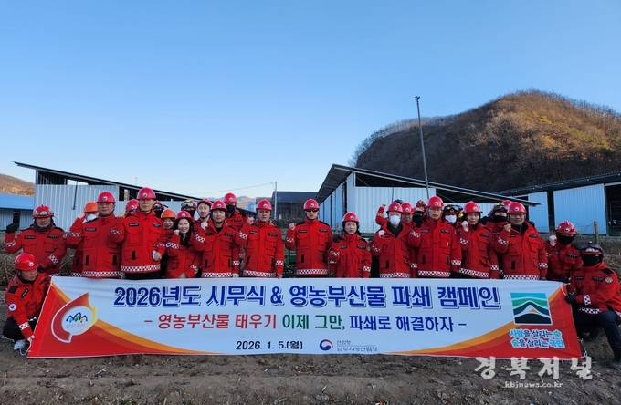 남부지방산림청(청장 임하수)은 5일 관내 국유림관리소와 함께 안동시 일직면 영농부산물 수거파쇄 현장에서 2026년 시무식과 안전보건 결의대회를 개최했다고 밝혔다.