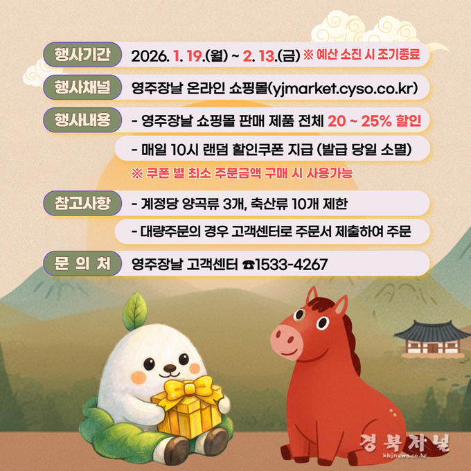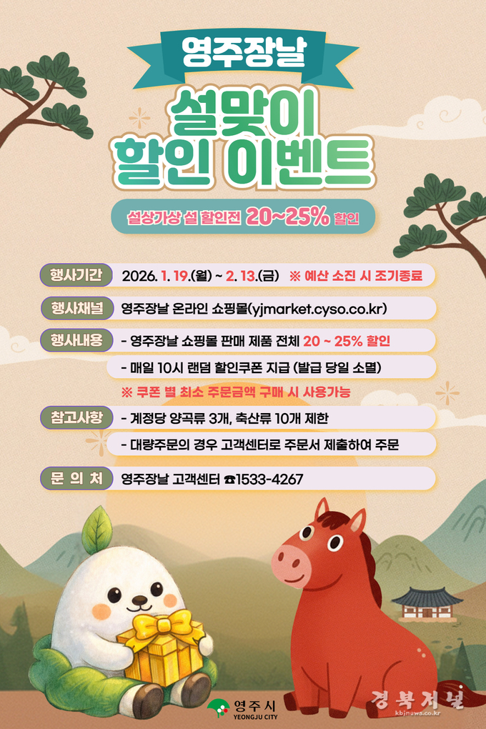 영주시는 설 명절을 앞두고 공식 온라인 쇼핑몰 ‘영주장날’을 통해 지역 농·특산물을 합리적인 가격에 구매할 수 있는 대규모 할인 행사를 진행한다고 밝혔다.