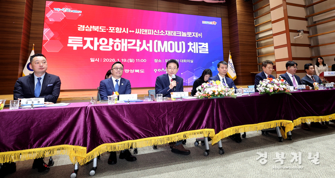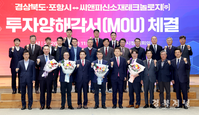 경상북도는 19일 포항시청 대회의실에서 포항시, 씨앤피신소재테크놀로지㈜와 함께 영일만4일반산업단지 내 리튬인산철배터리(LFP) 양극재 제조시설 건립을 위한 투자양해각서(MOU)를 체결했다.