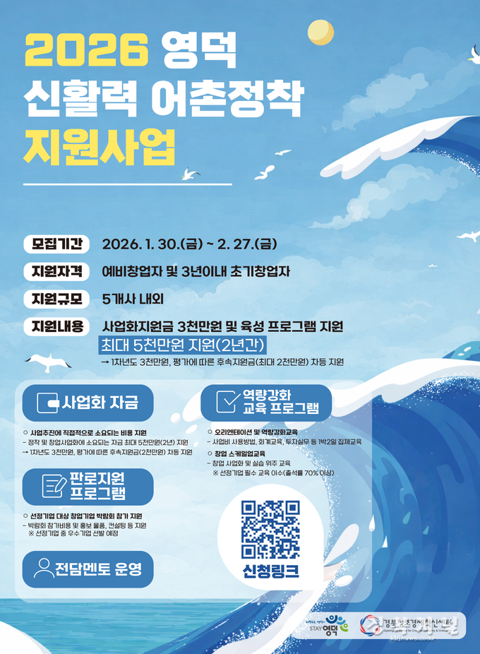 영덕군은 지역자원을 활용한 창업자를 발굴하고 육성하기 위해 ‘신활력 어촌정착 지원사업’에 참여할 창업자를 이달 27일까지 온라인으로 모집한다.