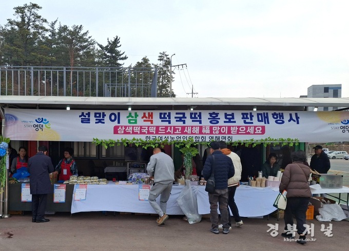 한국여성농업인연합회 영해면회는 설 연휴를 앞둔 지난 14일 영해휴게소에서 지역을 찾은 귀성객과 관광객들에게 삼색 떡국떡과 지역 농산물을 알리고 판매하는 행사를 펼쳤다.