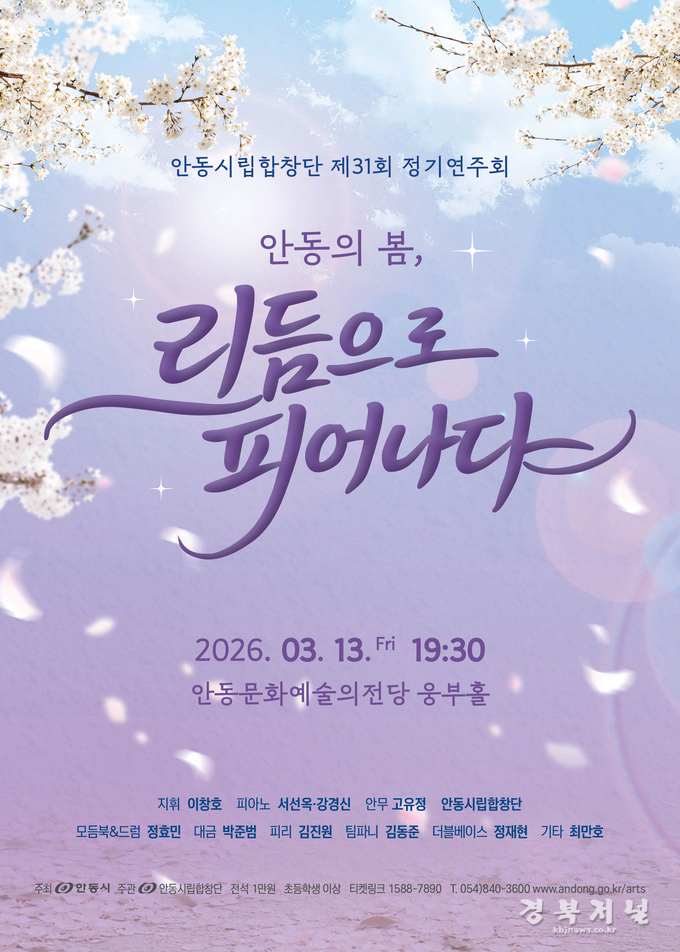 안동시립합창단 제31회 정기연주회 ‘안동의 봄, 리듬으로 피어나다’는 전석 1만 원이며 초등학생 이상 관람이 가능하다.