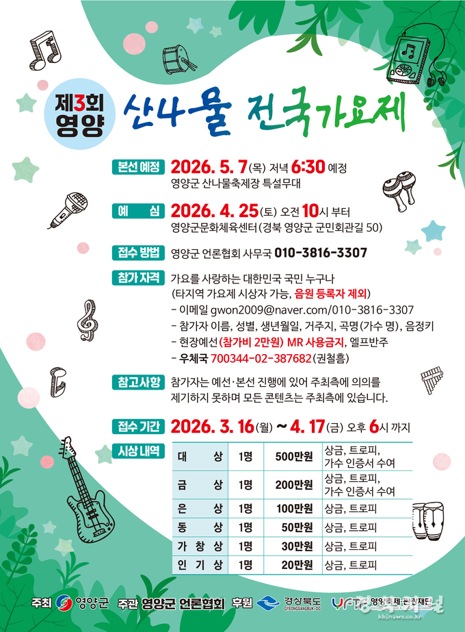 오도창 영양군수는 “올해로 3회째를 맞는 이번 가요제가 신인 가수들의 꿈을 이루는 통로이자, 영양의 풍성한 문화와 전통을 널리 알리는 계기가 되길 바란다”며, “주관사인 영양군언론협회와 협력해 내실 있고 탄탄한 행사를 준비하겠다”고 밝혔다.