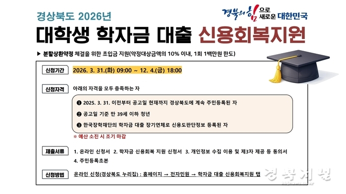 경북도가 도내 학자금 대출을 받은 대학생과 학자금 대출 장기 연체로 신용도 판단 정보에 등록된 사람을 대상으로 이자 지원 구간과 회복지원 범위를 확대해 경제적 부담 완화에 나선다.