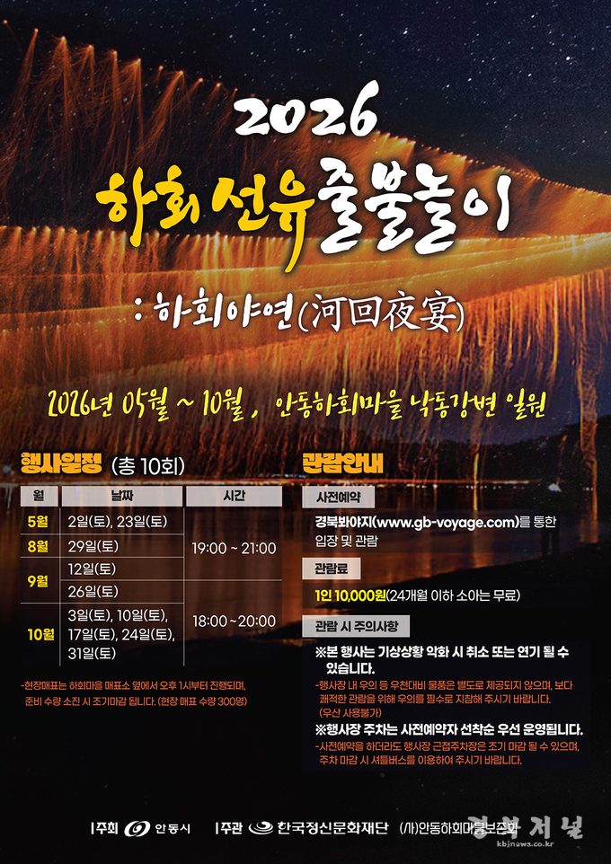 오는 5월 2일과 23일(토) 저녁 7시 하회마을에서는 안동의 대표 야간관광 콘텐츠인 ‘2026 하회선유줄불놀이’가 시연된다.