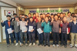 영주시농업기술센터는 지난 23일 농업체험교육관에서 교육생과 관계자 등 36명이 참석한 가운데 ‘영주 노지 스마트농업 기술교육’ 수료식을 개최했다. 이번 교육은 노지 스마트농업에 대한 이해를 높이고 스마트 방지망 설치 등 현장에서 활용 가능한 실용 기술을 보급하기 위해 추진됐다. 교육은 지난 3월 12일부터 4월 23일까지 총 7회(28시간)에 걸쳐 농업체험교육관과 영주폴리텍대학 융합관, 스마트 방지망 설치 농가 현장 등에서 이론과 실습을 병행하는 방식으로 운영됐다. 이날 수료식에서는 교육 과정을 이수한 31명에게 수료증이 수여됐으며, 수료생 대표 김영진 씨의 소감 발표와 단체 기념촬영이 이어졌다. 영주시는 스마트 영농 역량 강화를 위해 스마트농업 기술 확산과 현장 중심 전문교육을 지속적으로 추진할 계획이다. 최수영 기술지원과장은 “바쁜 영농철임에도 불구하고 미래 농업 기술 습득을 위해 끝까지 교육에 참여해 주신 수료생들의 열정에 박수를 보낸다”며, “앞으로도 노지 스마트농업 기술이 현장에 안정적으로 정착될 수 있도록 다양한 기술 지원을 아끼지 않겠다”고 밝혔다. 스마트농업 관련 문의는 영주시농업기술센터 기술지원과 기술개발팀(☎054-639-7386)으로 하면