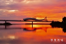 붉은 여명이 남대천으로 번지며 은어다리가 선명한 존재감을 드러낸다. 은어다리는 울진을 대표하는 상징적인 다리로 은어의 형태를 모티브로 한 유려한 곡선이 매력적이다. 새벽빛의 색감과 은어다리의 곡선이 어우러지며 생동감 넘치는 울진의 아침이 시작된다. 최선학 기자 kbnews7005@hanmail.net