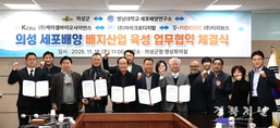 의성군(군수 김주수)은 11월 18일 영남대학교 세포배양연구소(소장 최인호), ㈜케이셀바이오사이언스(대표 강기용), ㈜마이크로디지탈(대표 김경남), ㈜티리보스(대표 윤형호)와 함께 세포배양 배지 산업 육성을 위한 5자 업무협약(MOU)을 체결했다. 이번 협약은 지난해 의성군·영남대학교 세포배양연구소·㈜마이크로디지탈·㈜티리보스 간에 체결된 세포배양산업 육성 협력체계를 한 단계 확대한 것이다. 이를 통해 기존 장비·원부자재 중심의 협력 구조에 세포배양 배지 핵심 소재 연구 역량이 더해져, 세포배양산업 전체를 아우르는 협력체계가 완성될 것으로 기대된다. 협약에 참여한 5개 기관은 향후 세포배양 배지 원료 및 공정 기술의 국산화, 공동 연구개발 과제 추진, 해외 의존도가 높은 바이오 부품의 대체 기술 확보 및 현장 맞춤형 전문인력 양성 과정을 운영하기로 뜻을 모았다. 특히 이번에 새롭게 참여한 ㈜케이셀바이오사이언스는 분말형 세포배양 배지 개발 및 제조기술을 보유한 전문기업으로, 대한민국 산업대상 퍼스트 클래스 대상을 2년 연속 수상하는 등 세포배양 배지 제조기술 개발 및 상용화에 기여하고 있다. ㈜케이셀바이오사이언스 강기용 대표는 “이번 업무협약을 통해 의성군과 영