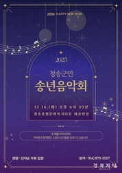 청송군(군수 윤경희)은 한 해를 마무리하며 오는 16일 오후 6시 30분 청송문화예술회관 대공연장에서 ‘2025 청송군민 송년음악회’를 개최한다고 밝혔다. 이번 음악회는 청송문화원이 주관하고 청송군과 청송군의회가 후원하는 행사로, 지역 문화예술인과 인기 초대가수들이 함께해 군민 모두가 즐길 수 있는 다채로운 공연을 선보일 예정이다. 특히, 한 해 동안 군민들이 만들어온 성과를 되돌아보고 새로운 도약을 준비하는 의미 있는 송년의 장으로 마련됐다. 공연은 청송문화원 풍물단의 사물놀이로 힘차게 막을 올린 뒤, 청송문화원 합창단 등 지역 문화예술인의 무대가 이어져 지역 예술의 저력을 보여줄 예정이다. 또한 초대가수 구창모, 왁스, 권미희가 참여해 다양한 장르의 음악과 매력적인 무대로 현장의 분위기를 더욱 뜨겁게 달굴 것으로 기대된다. 청송군 관계자는 “이번 공연이 군민 여러분께 올 한 해를 되돌아보고 서로를 격려하는 따뜻한 시간이 되길 바란다.”며, “2025년을 잘 마무리하고, 다가오는 2026년 병오년을 희망과 기대 속에 맞이하는 뜻깊은 행사가 되기를 바란다.”고 전했다. 최선학 기자 kbnews7005@hanmail.net