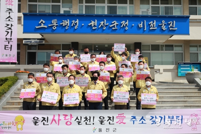 울진군(군수 전찬걸)은 27일 김재준 부군수를 비롯한 간부공무원들과 함께“울진사랑실천! 울진愛 주소갖기 운동”캠페인을 실시하였다.