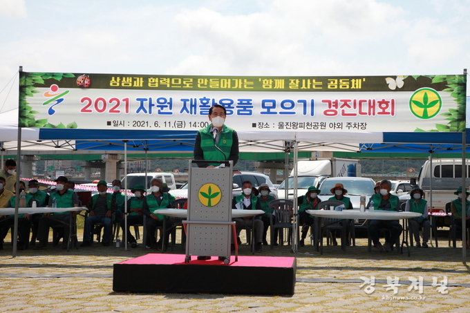 울진군새마을회(회장 신용철)는 지난 11일 울진 왕피천공원 야외 주차장에서 지구온난화 방지 및 2050 탄소중립 실현을 위한 ‘2021 자원재활용품 수집 경진대회’를 새마을회 남녀지도자 150여 명이 참여한 가운데 개최하였다.