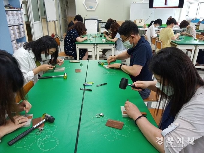 ‘가죽 공예에 사용되는 가죽’, ‘가죽 공예의 과정’에 대한 이론적 강의와 함께 교원들이 직접 가죽에 바늘 길 만들고(목타), 바느질(새들스티치)을 통해 키링과 카드 지갑을 완성해 보는 시간을 가졌다. 바늘 길을 만들며 시행착오를 거치는 교원들도 있었지만, 한땀 한땀 정성스레 바느질을 하며 자신만의 결과물을 제작하는 모습은 사뭇 진지해 보였다.