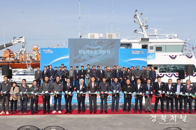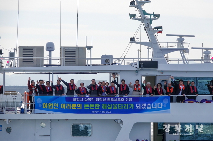 포항시가 어업인들의 안전 조업을 위한 든든한 해상울타리이자 기업투자 유치를 위한 업무협약 공간 등 다목적 활용을 위해 건조한 130톤급 신규 행정선 ‘연오세오호’가 25일 취항식을 갖고 본격적으로 첫 항해를 시작했다.