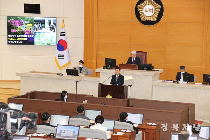이강덕 포항시장은 8일 제301회 포항시의회 정례회 시정연설을 통해 내년도 시정 운영 방향으로 “‘세계로 도약하는 환동해중심도시 포항 건설’을 위해 안전·경제·환경·문화·복지 등 5개 분야에 시정 역량을 집중하고 시민 여러분과 함께 미래 백 년 지속가능한 포항의 기반을 마련하겠다”라고 강조했다.