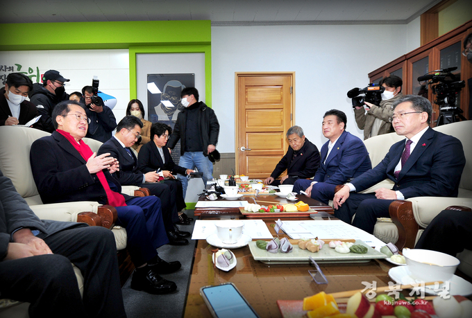 김진열 군위군수는 12월 16일 오후 3시 대구편입 법률안의 국회 통과를 기념하여 군위를 방문한 홍준표 대구시장을 만나 군정 주요현안을 보고했다.