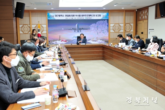 군위군은 19일 군청 제2회의실에서 대구광역시 편입에 따른 부서별 세부 추진계획 2차 보고회를 열었다.