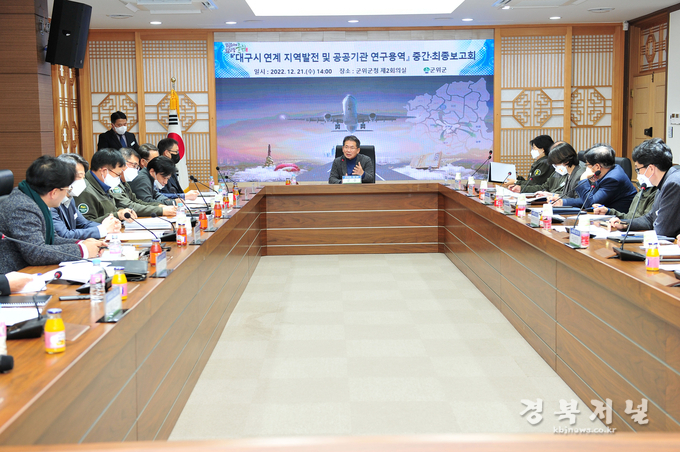 군위군(군수 김진열)은 21일 2시 군청 제2회의실에서 『대구시 연계 지역발전 방안 계획 수립 연구용역』중간보고회 및 『대구시 공공기관 유치방안 연구용역』최종보고회를 개최했다.