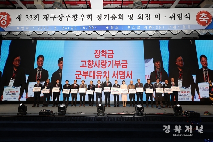 상주시 출신들의 모임인 재구 상주향우회(회장 백준기)가 24일(금) 18시 대구 엑스코에서 ‘2023년 정기총회 및 회장 이취임식’을 개최했다.