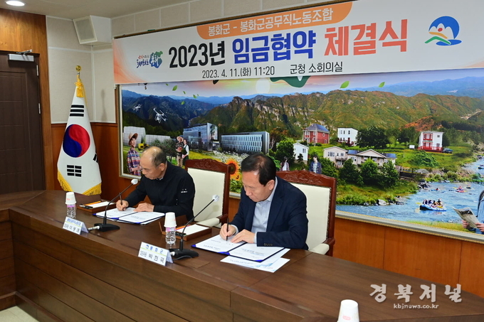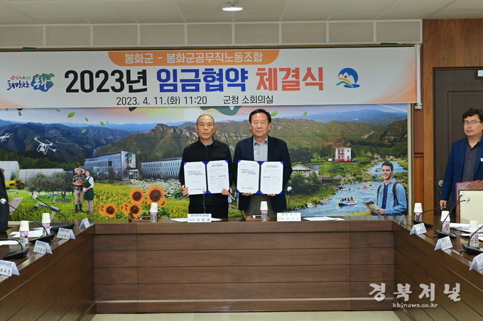 봉화군은 꾸준한 노사협력과 신뢰를 바탕으로 11일 봉화군청 2층 소회의실에서 봉화군공무직노동조합과의 ‘2023년 봉화군-봉화군공무직노동조합 임금협약’을 체결했다고 밝혔다.