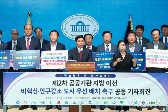 안동시를 비롯한 18개 인구감소지역 지자체가 25일 국회소통관에서 제2차 공공기관 지방이전 시 인구감소지역으로 이전할 것을 촉구하는 공동 기자회견을 개최했다.