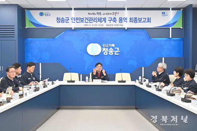 청송군(군수 윤경희)은 5월 31일 군청 미래도약실에서 윤경희 청송군수와 간부 공무원들이 참석한 가운데 안전보건관리체계 구축 용역 최종보고회를 개최했다.