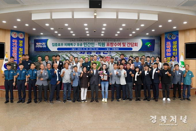 영주시는 30일 시청 강당에서 간담회를 열고 집중호우 피해복구 현장의 영웅들에게 유공자 표창을 수여했다.