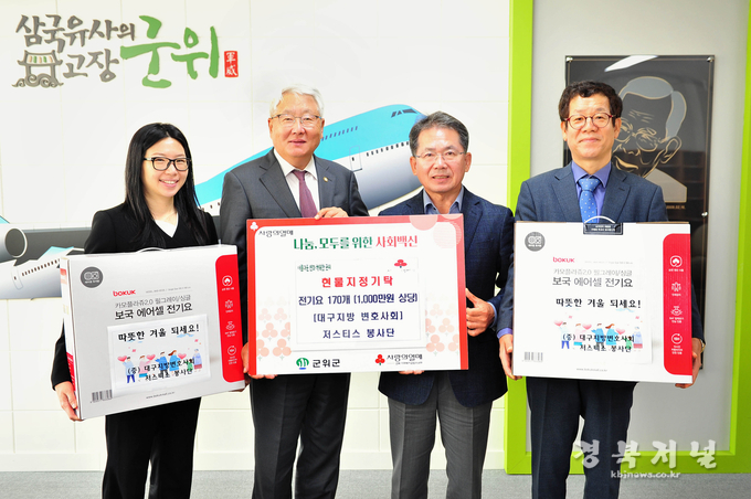 군위군은 지난 18일 대구지방변호사회 저스티스 봉사단에서 군청을 방문해 도움이 필요한 이웃들에게 나눔을 실천하고 싶다며 전기요 170개 약 1,000만원 상당의 물품을 기탁했다고 말했다.