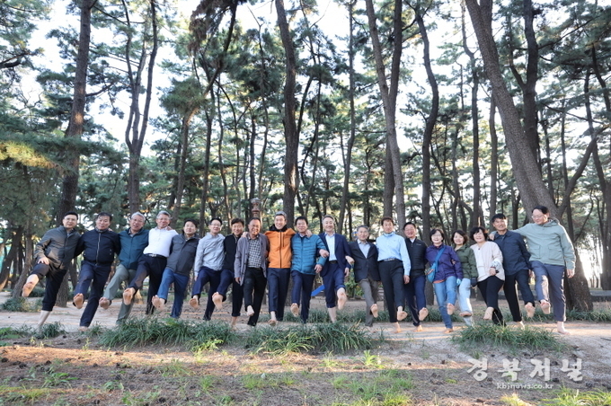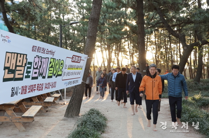 이강덕 포항시장은 23일 송도 솔밭에서 4급 이상 간부공무원과 함께 맨발로 걸으며 시정 현안과 관련한 소통 회의를 진행했다.