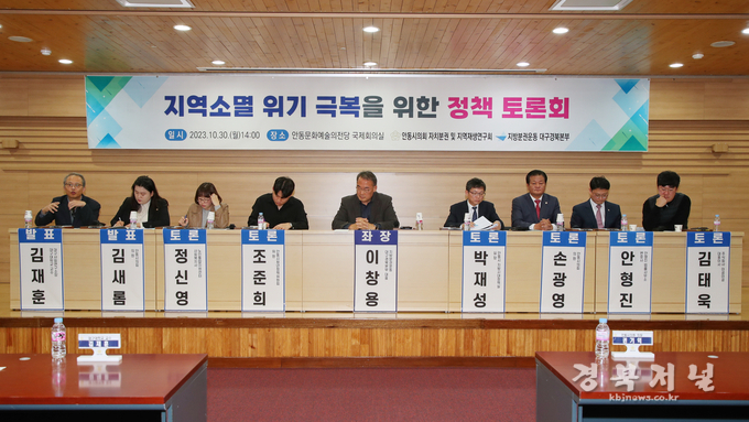 주제 발표 이후 이어진 지정토론에는 이창용 지방분권운동 대구경북본부 대표를 좌장으로, 손광영 의원, 박재성 안동시 지방시대정책실장, 안형진 변호사, 김태욱 주식회사 이공이공 대표, 정신영 노인통합지원센터 사회복지사, 조준희 안동시 청년정책위원이 패널로 참여하여 다양한 지역소멸 극복 위기 방안을 제시했다.