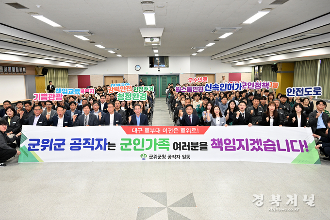 군위군은 지난 3일 군청 대회의실에서 개최된 6월 정례조회에서 김진열 군수를 비롯한 700여 공직자가 참석한 가운데, 대구 군부대 이전에 대한 전방위적 행정 지원을 약속하는 특별한 퍼포먼스를 시행했다.