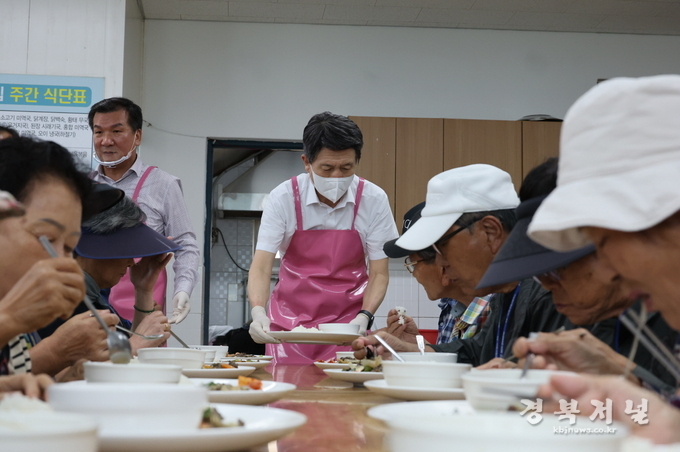 이강덕 포항시장이 2일 추석을 앞두고 무료급식소 ‘만나의집’을 방문해 어르신 200여 명에게 배식 봉사를 하며 감사의 마음을 전했다.
